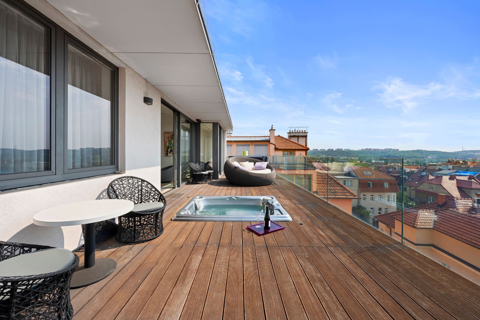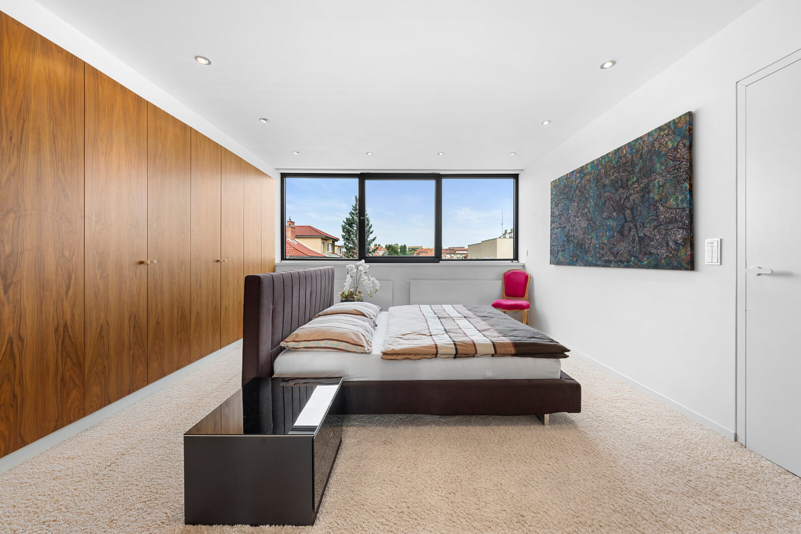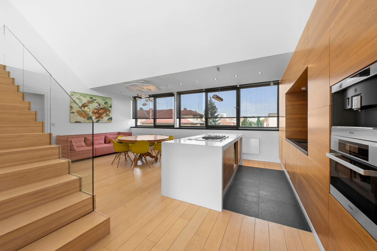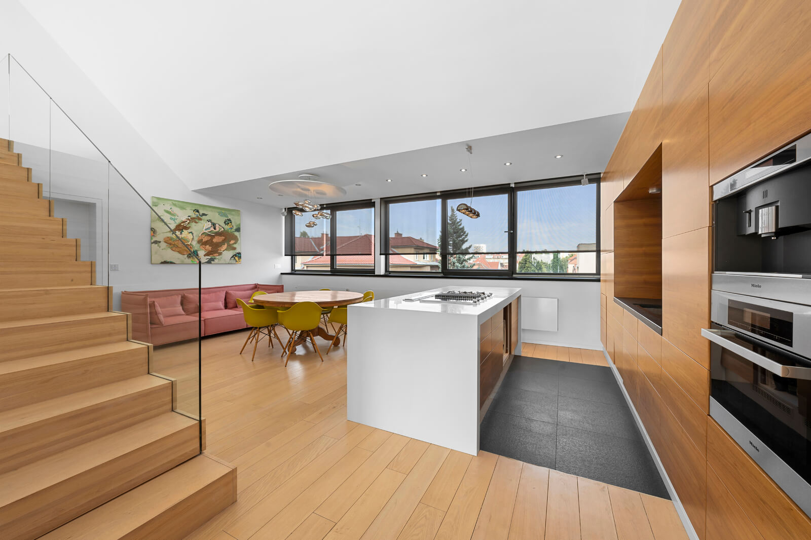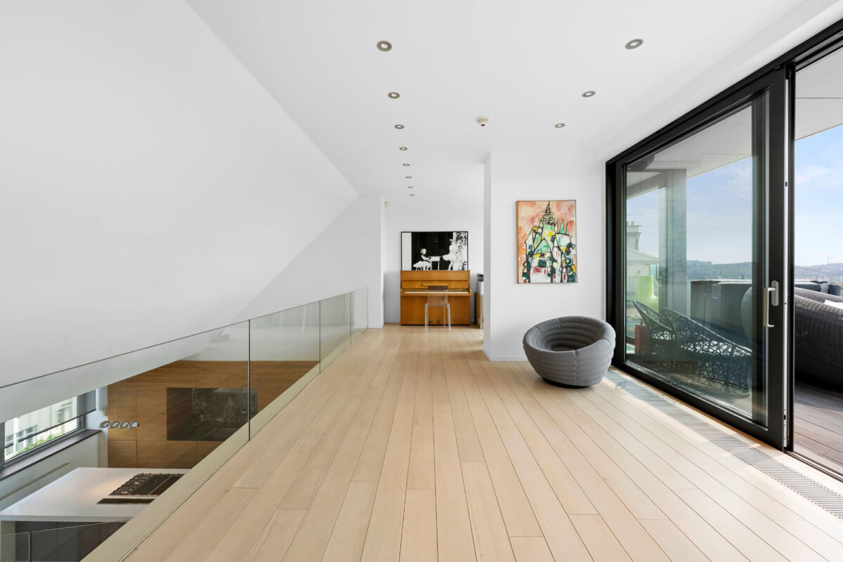 Druhé patro: Galerie se vstupem do druhé ložnice a koupelny. Z galerie je také přístup na krásnou terasu o rozloze 40 m2, která nabízí absolutní soukromí. V bytě jsou dřevěné podlahy, vlněné koberce, bezpečnostní vstupní dveře, designové a chytré osvětlení, dostatek úložných prostor, pračka, sušička a vestavěné spotřebiče v kuchyni značky Miele.