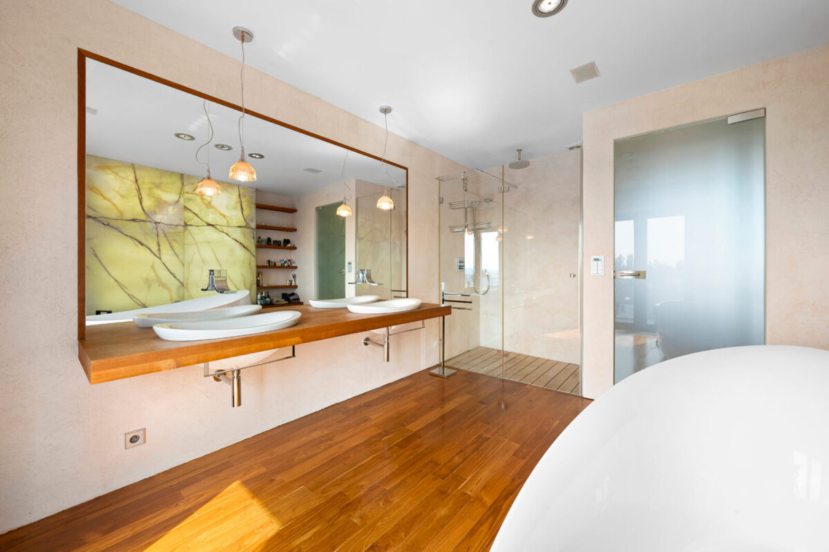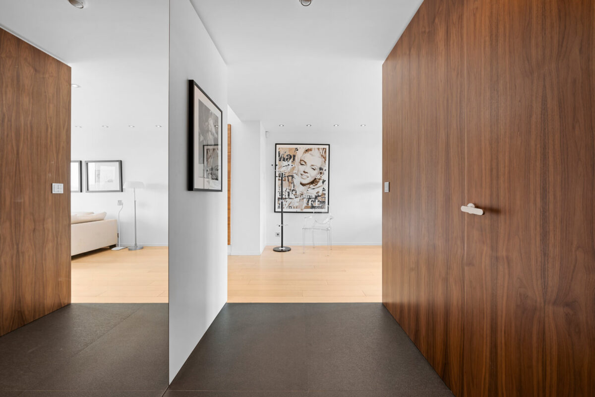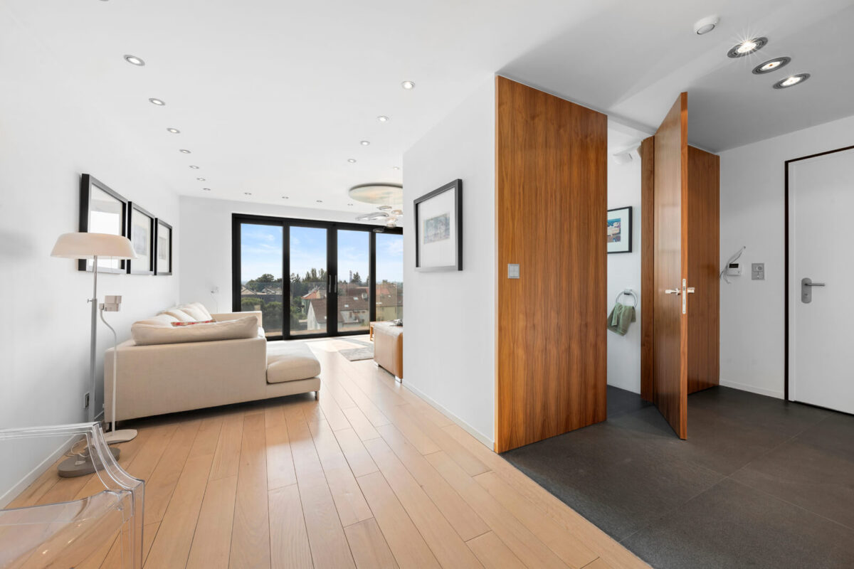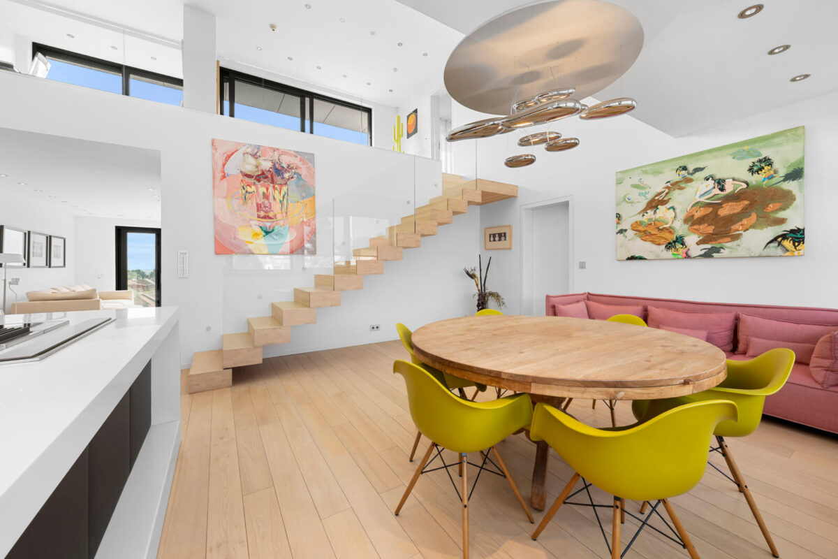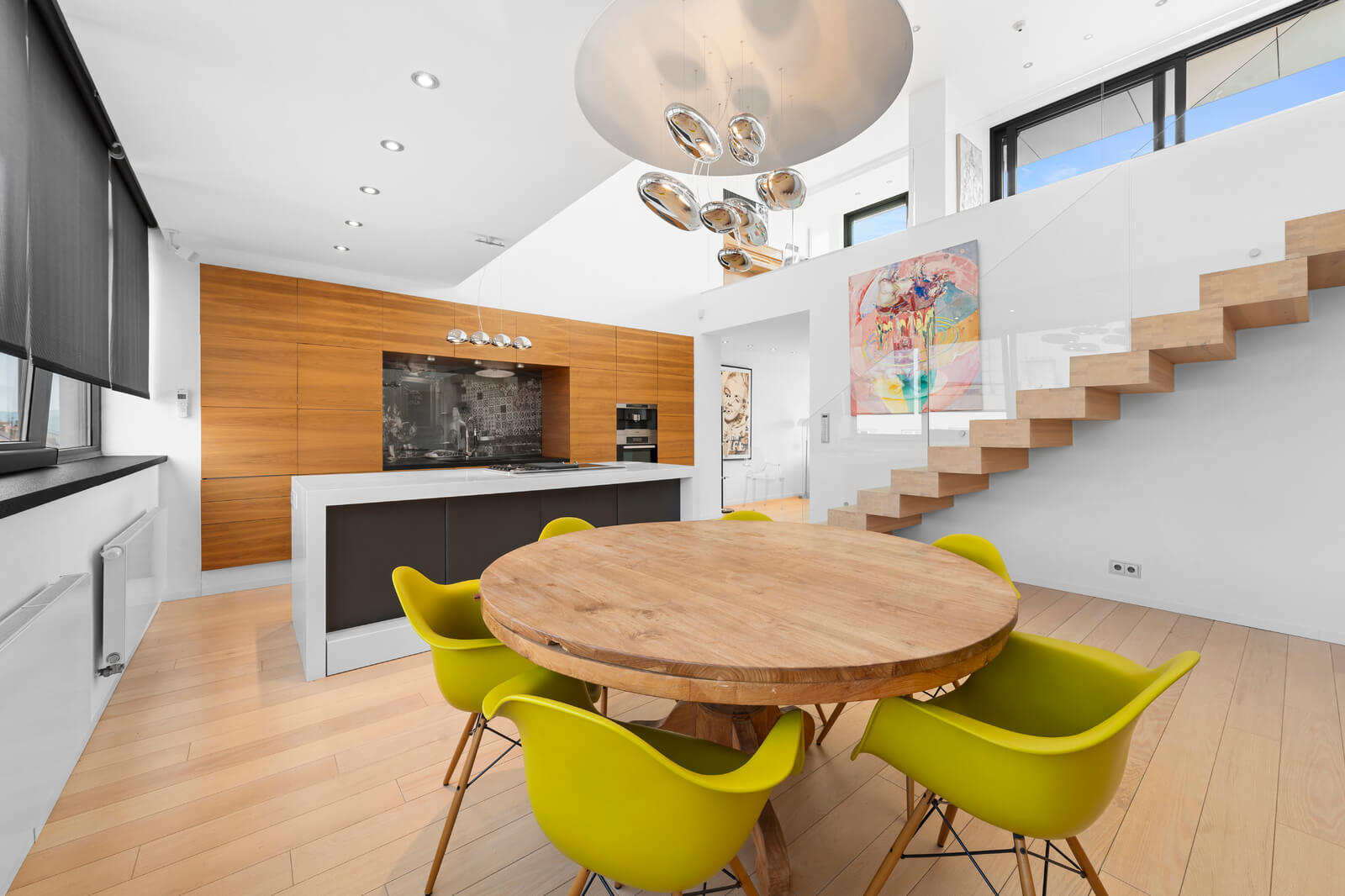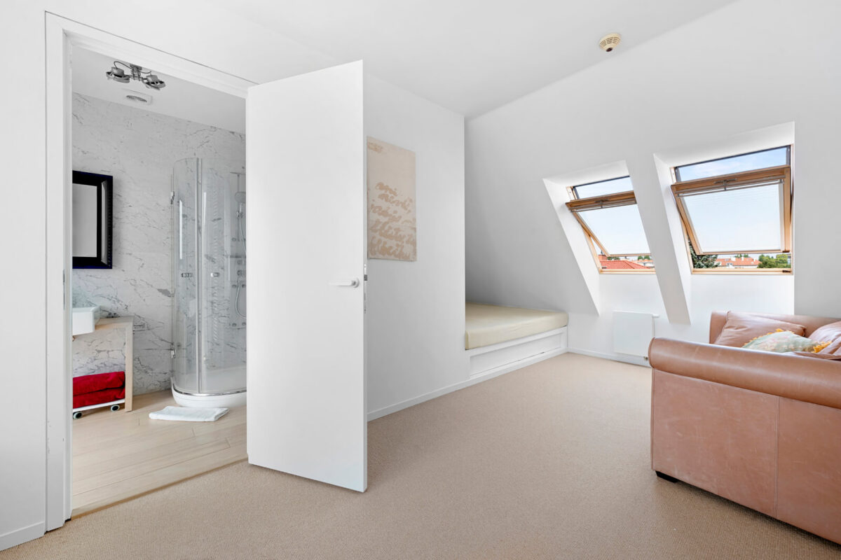 Druhé patro: Galerie se vstupem do druhé ložnice a koupelny. Z galerie je také přístup na krásnou terasu o rozloze 40 m2, která nabízí absolutní soukromí. V bytě jsou dřevěné podlahy, vlněné koberce, bezpečnostní vstupní dveře, designové a chytré osvětlení, dostatek úložných prostor, pračka, sušička a vestavěné spotřebiče v kuchyni značky Miele.