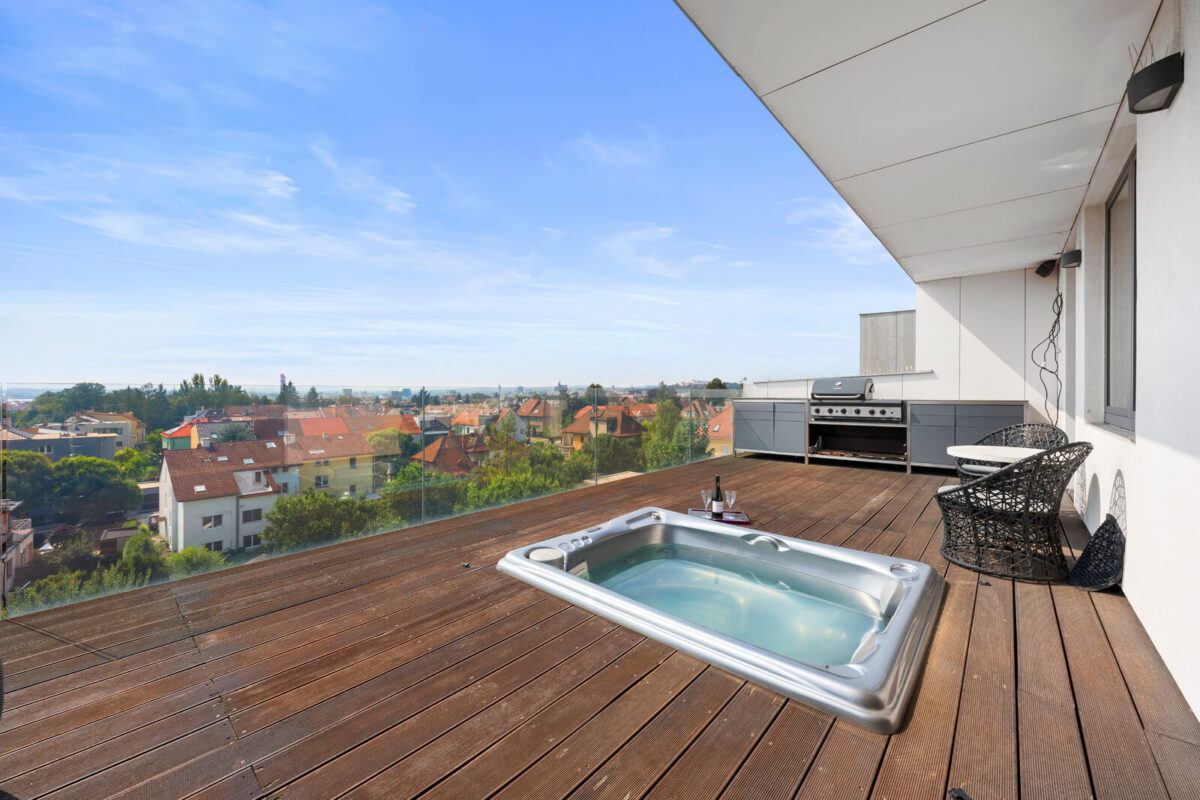 Nabízíme k pronájmu moderní a luxusně vybavený mezonetový byt s balkonem a terasou, který nabízí překrásný výhled na město Brno. Byt se nachází ve 4. podlaží bytového domu bez výtahu.