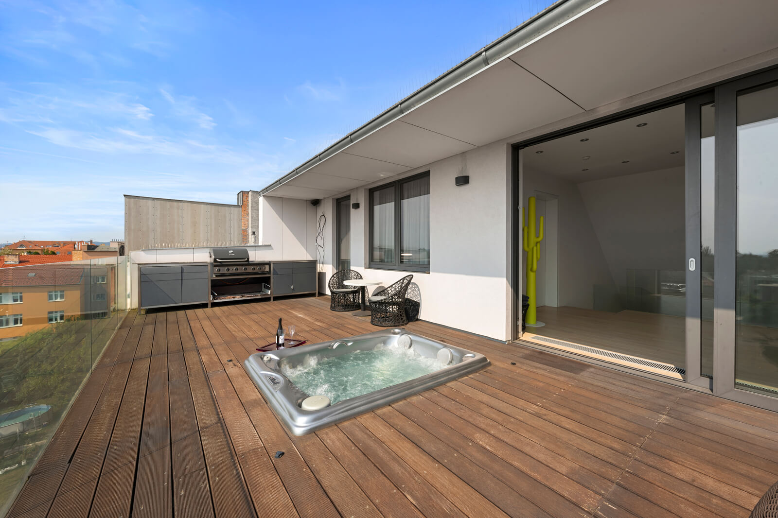 Budova se nachází na prestižní adrese v ulici Zemědělská, v klidné lokalitě s veškerou občanskou vybaveností. Centrum města je v pěší vzdálenosti, s MHD dojedete za zhruba 10 minut. Nedaleko domu je autobusová i tramvajová zastávka. Interiér bytu je moderně a nadstandardně vybaven. Hlavní předností je prostorná terasa se zabudovanou vířivkou značky USSPA.