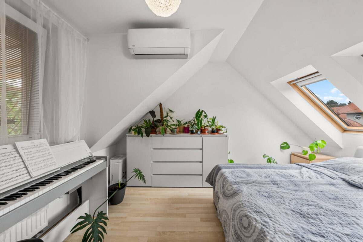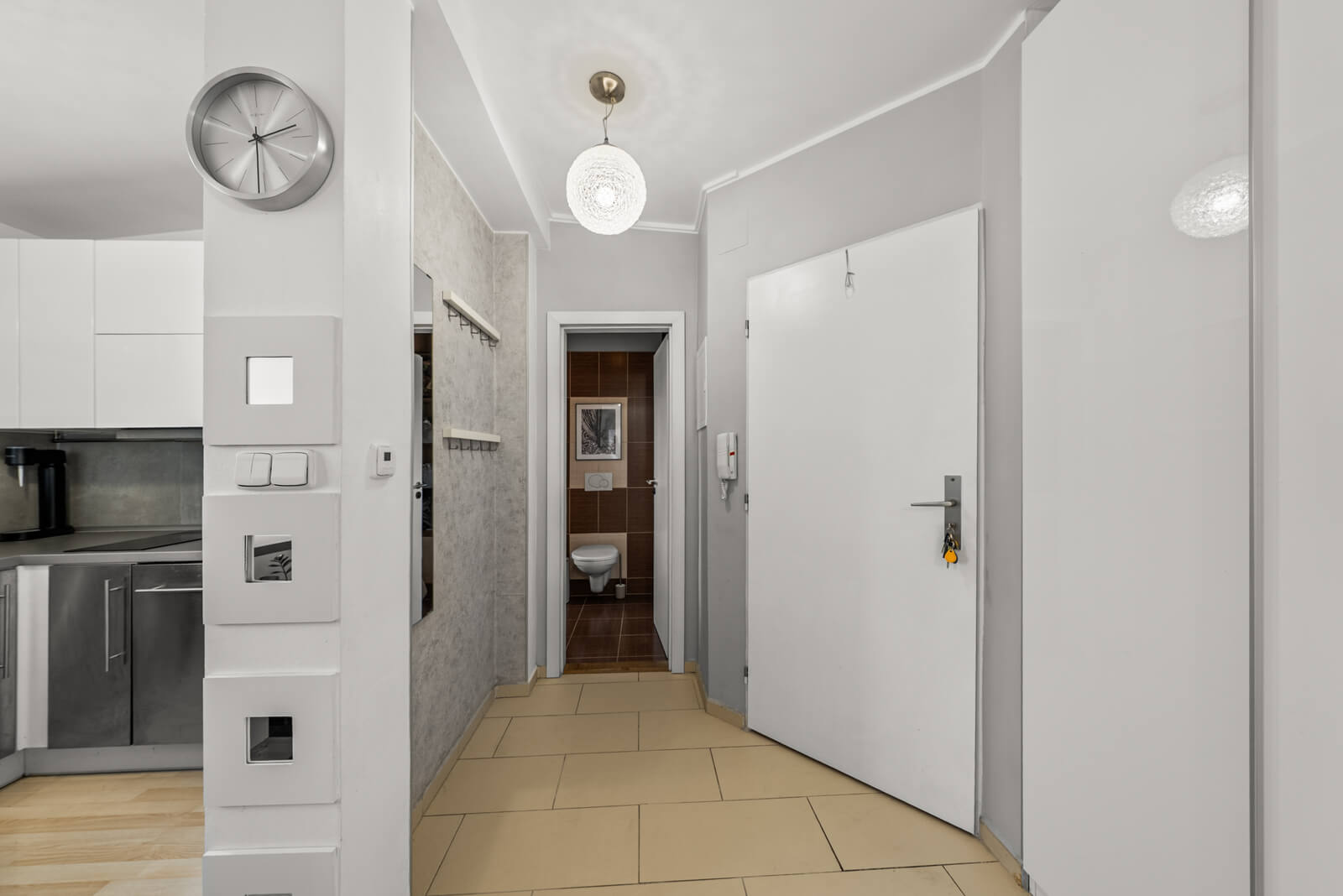 Dispozice bytu je promyšlená: vstupní část vás přivede přímo do světlého obývacího pokoje s kuchyní, odkud je vstup do dvou samostatných ložnic a koupelny s toaletou. Koupelna je vybavena vanou a plynovým kotlem, který zajišťuje vytápění i ohřev vody. O pohodlí v letních měsících se postará klimatizace.