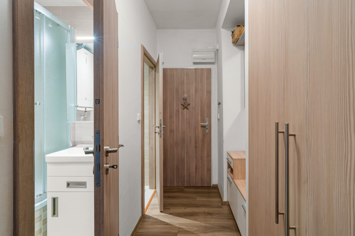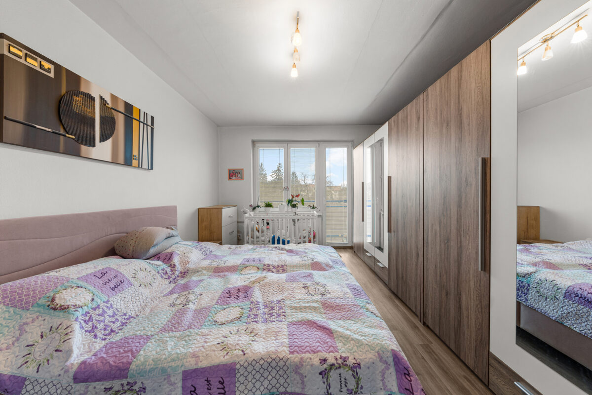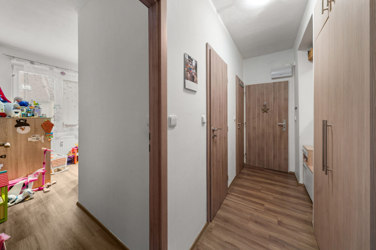 Po vstupu do bytu se ocitnete v chodbě s vestavěnými skříněmi, ze které je přístup do koupelny a na samostatnou toaletu. Dále se z chodby vstupuje do jedné ložnice a do obývacího pokoje s kuchyňským koutem. Z obývací části je pak přímý vstup do druhé ložnice, ke které náleží balkon o velikosti 1,8 m². Dispozice je praktická, funkční a dobře odděluje klidovou a obytnou část bytu.