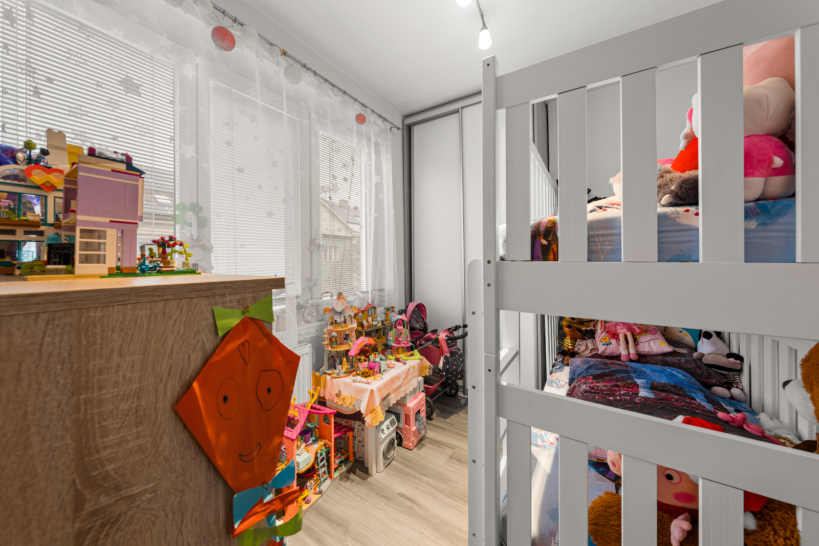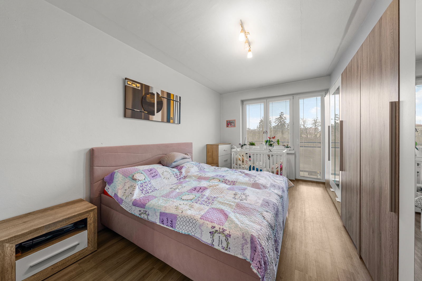 Po vstupu do bytu se ocitnete v chodbě s vestavěnými skříněmi, ze které je přístup do koupelny a na samostatnou toaletu. Dále se z chodby vstupuje do jedné ložnice a do obývacího pokoje s kuchyňským koutem. Z obývací části je pak přímý vstup do druhé ložnice, ke které náleží balkon o velikosti 1,8 m². Dispozice je praktická, funkční a dobře odděluje klidovou a obytnou část bytu.