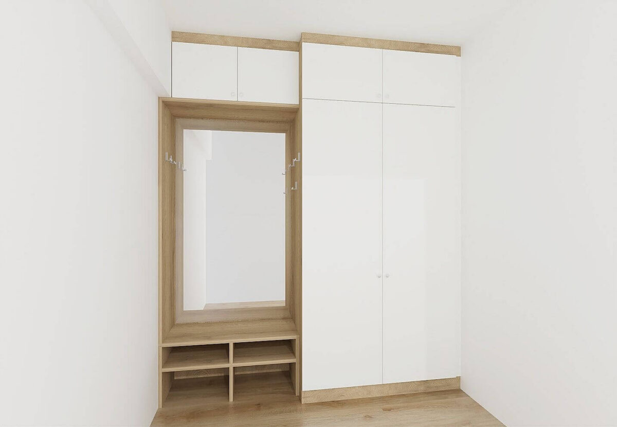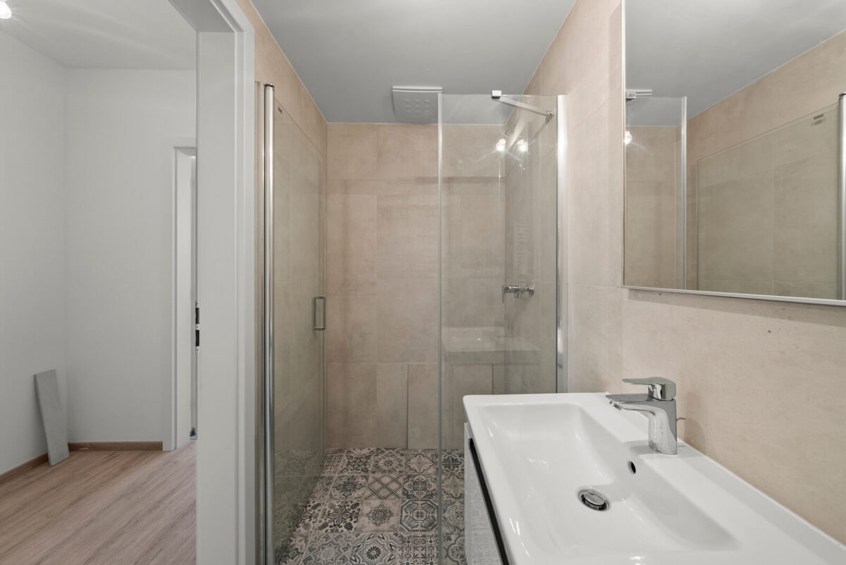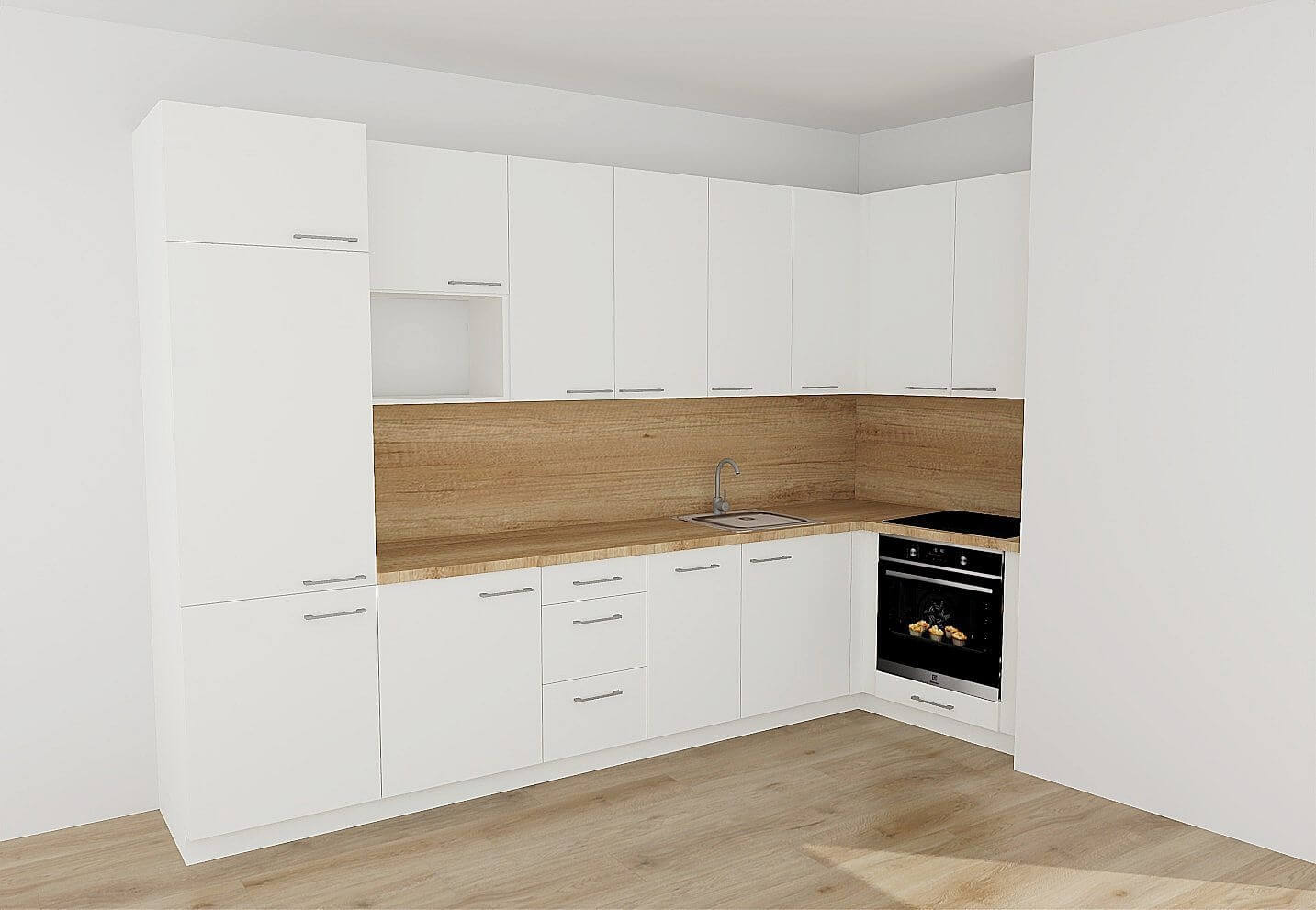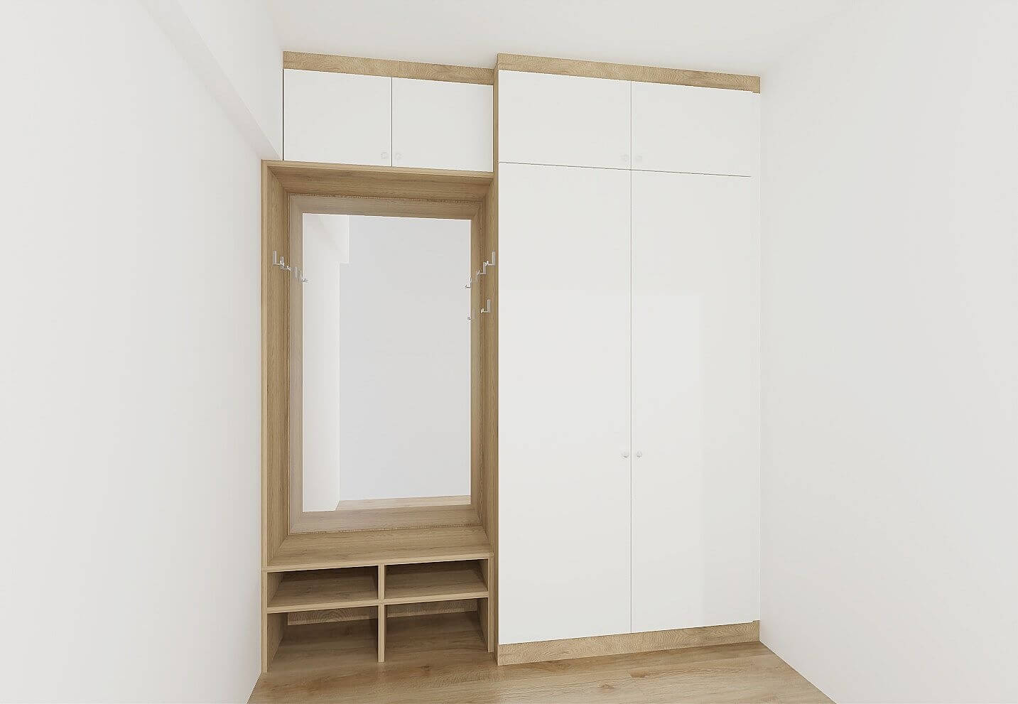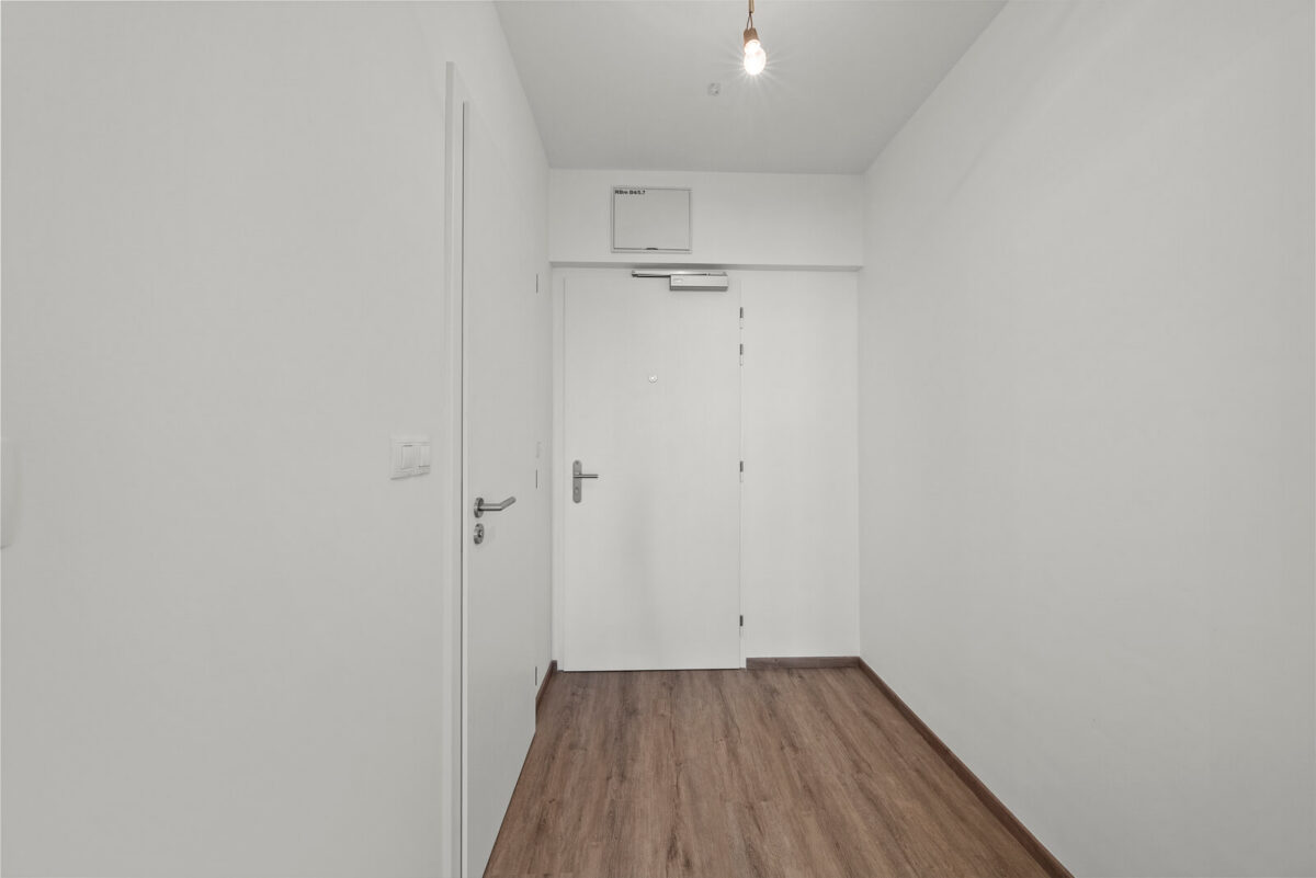 Při vstupu se nacházíte v předsíni, kde bude nově instalována vestavěná skříň. Z předsíně vedou samostatné vstupy do koupelny s toaletou a do hlavní obytné místnosti s kuchyňským koutem. Kuchyňská linka je ve fázi dokončování a bude vybavena spotřebiči – indukční varnou deskou, troubou, lednicí a pračkou.