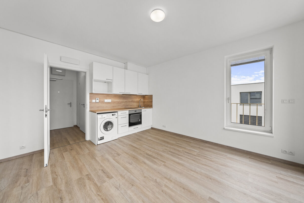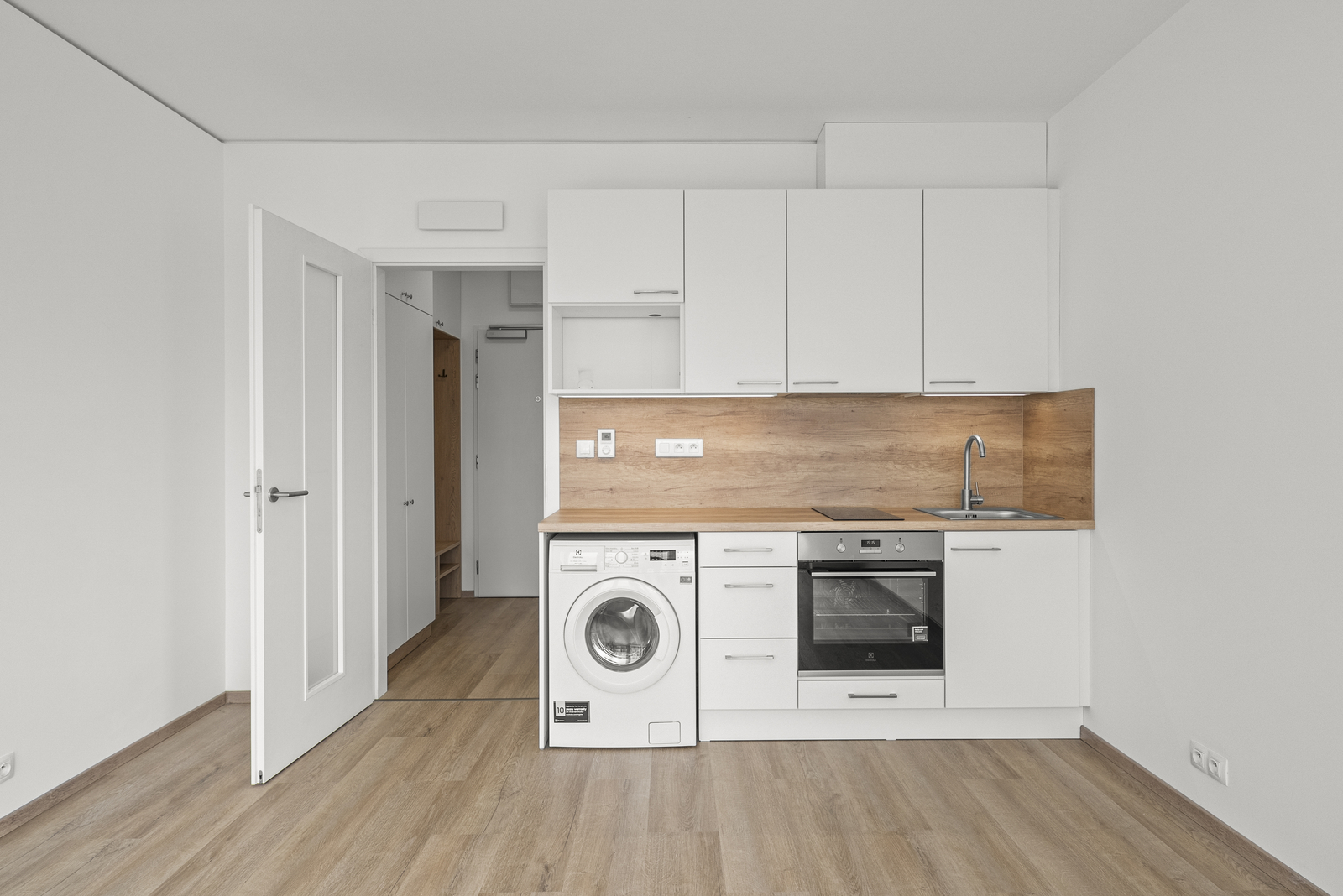 Při vstupu se nacházíte v předsíni, kde je připraven dostatek úložného prostoru v podobě vestavěné skříně. Z předsíně vedou samostatné vstupy do koupelny s toaletou a do hlavní obytné místnosti s kuchyňským koutem. Kuchyňská linka je vybavena indukční varnou deskou a troubou. Součástí nájmu je lednice a pračka.
