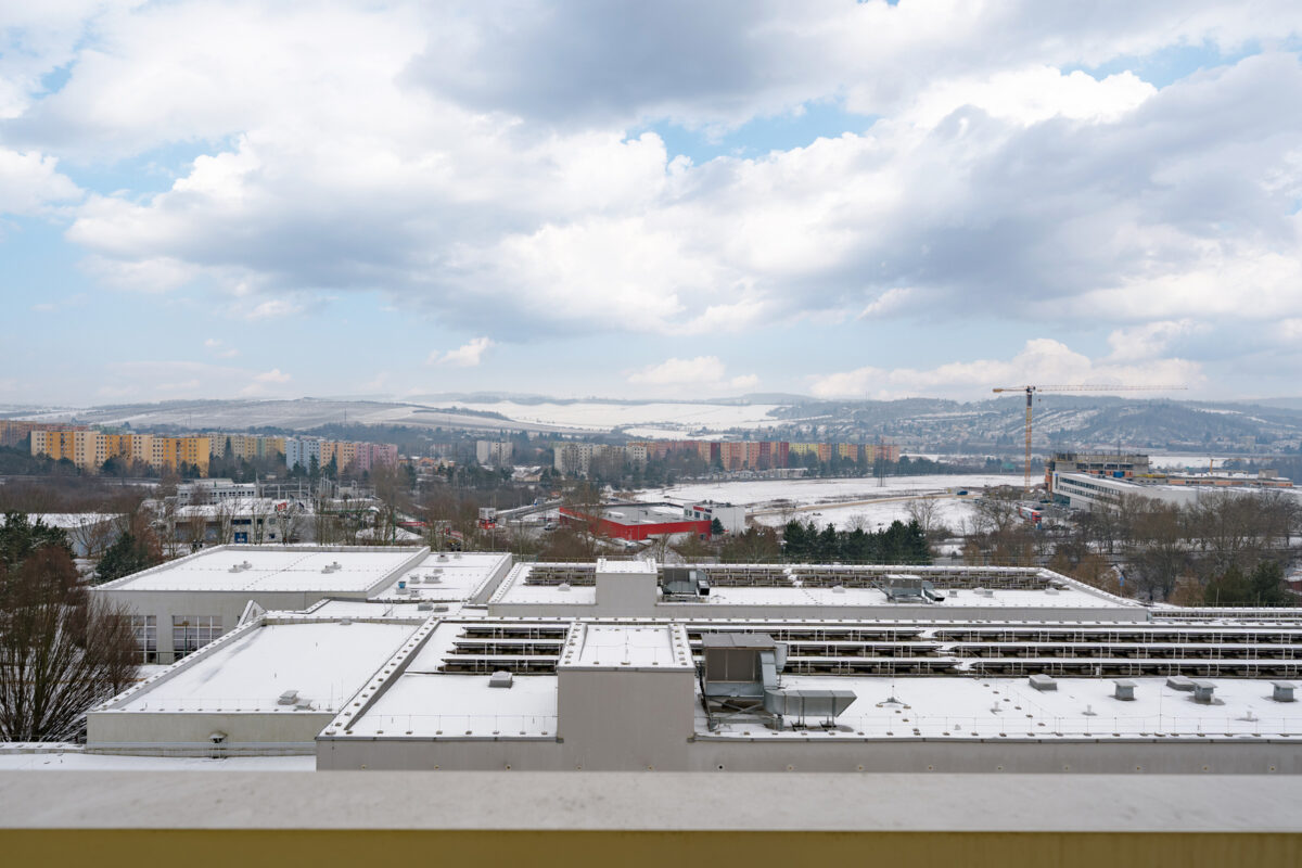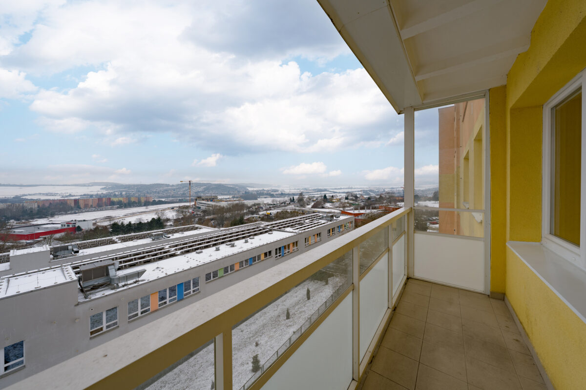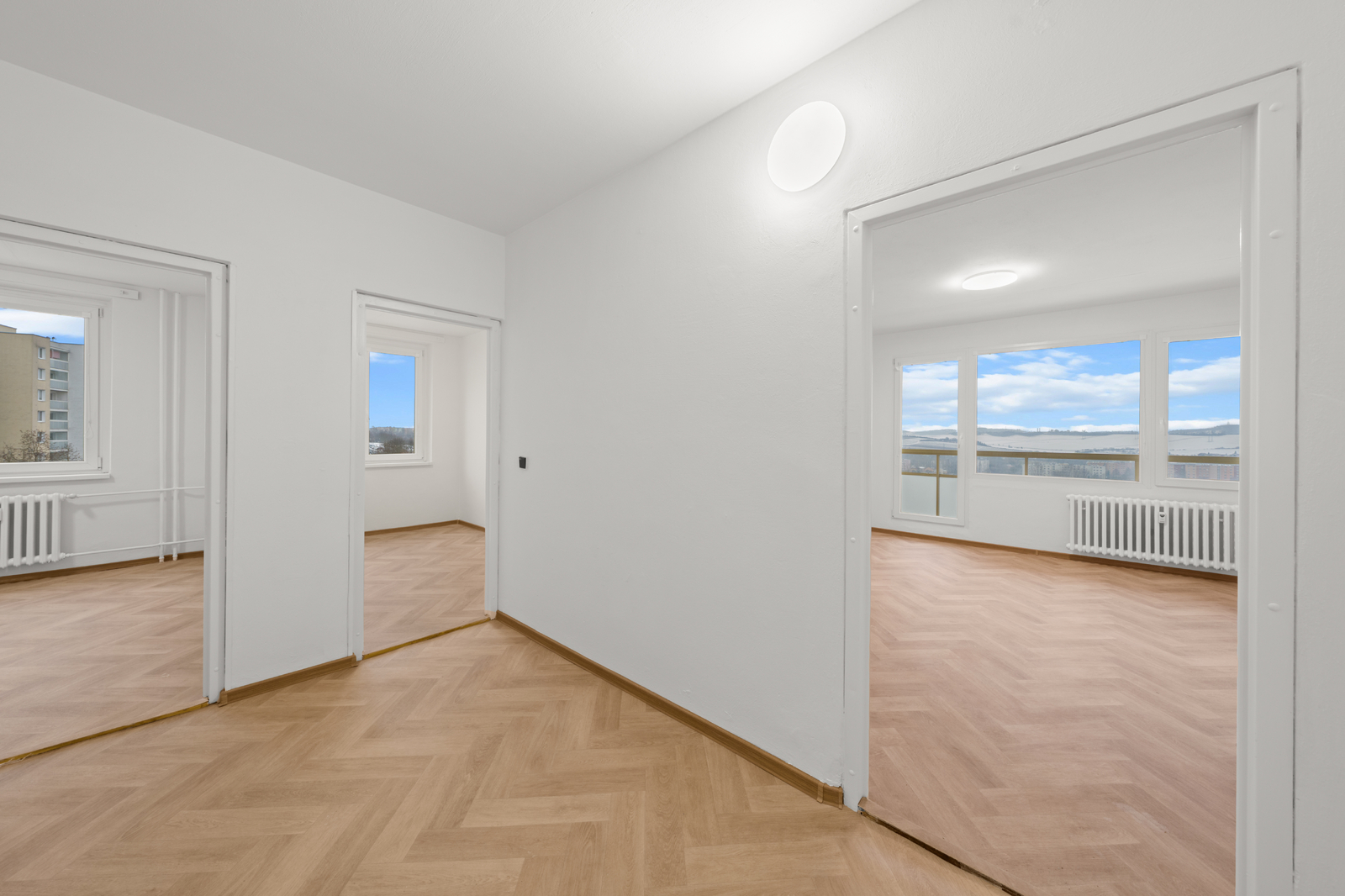 Dispozice bytu je velmi funkční. Po vstupu se nacházíte v prostorné chodbě, odkud je přístup do dvou samostatných neprůchozích pokojů. Dále se vstupuje do obývacího pokoje, ze kterého je průchod do dalšího pokoje a zároveň do kuchyně. Z kuchyně se dostanete do hlavní chodby s vestavěnou skříní, odkud je samostatný vstup na toaletu a do koupelny. Z obytné části je vstup na lodžii, která poskytuje příjemný venkovní prostor a výhled do okolí.