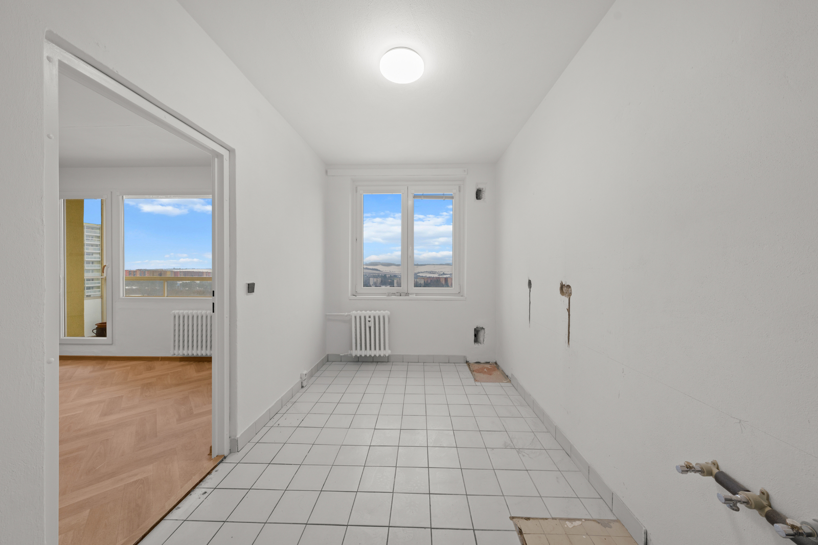 Kuchyňská linka je zcela nová a aktuálně je ve výrobě. Součástí kuchyně bude myčka, trouba a indukční varná deska. V bytě zůstává také lednice a pračka. Byt je jinak prázdný, což umožňuje jeho zařízení podle vlastních potřeb. Byt prošel modernizací, která zahrnuje nové bezpečnostní vstupní dveře, nové podlahy, nové interiérové dveře a novou kuchyňskou linku.