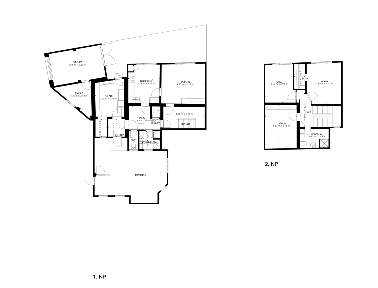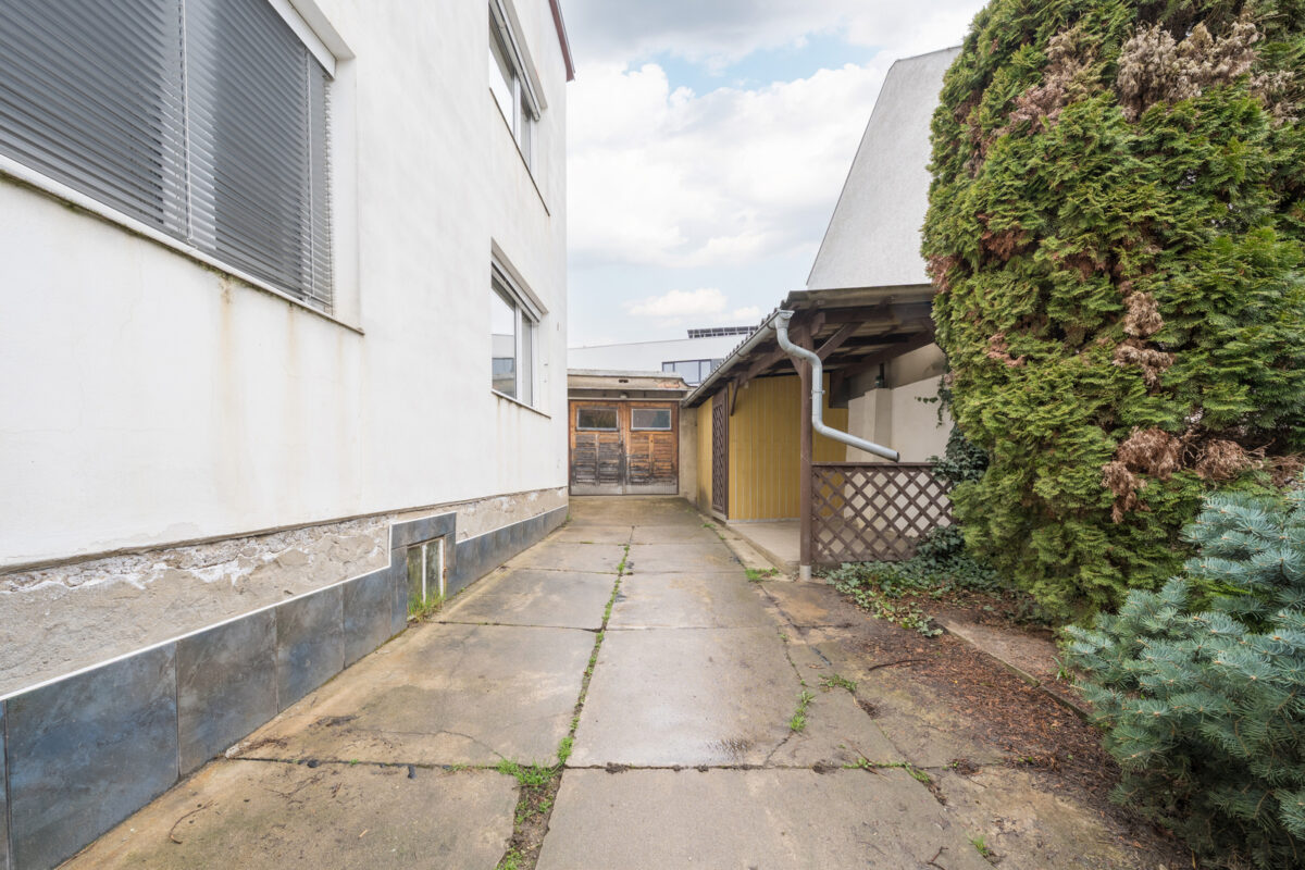 Při vstupu do domu se ocitnete v uzavřeném dvorku, odkud je přímý vstup do obytné části domu. Z dvorku je zároveň přístup do dílny, ze které lze dále projít na zahradu a do garáže (výška 1,8 m, šířka 2,3 m).